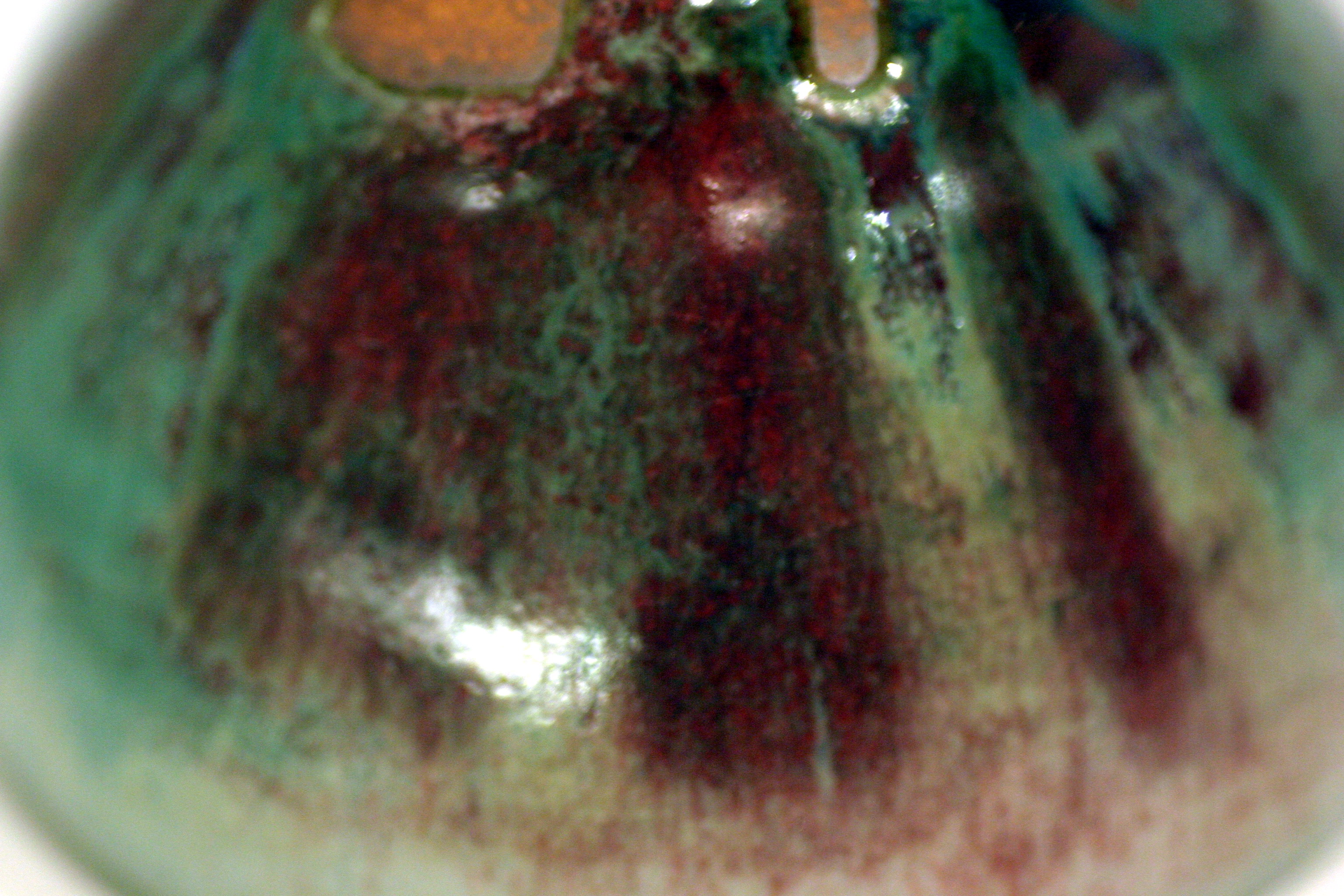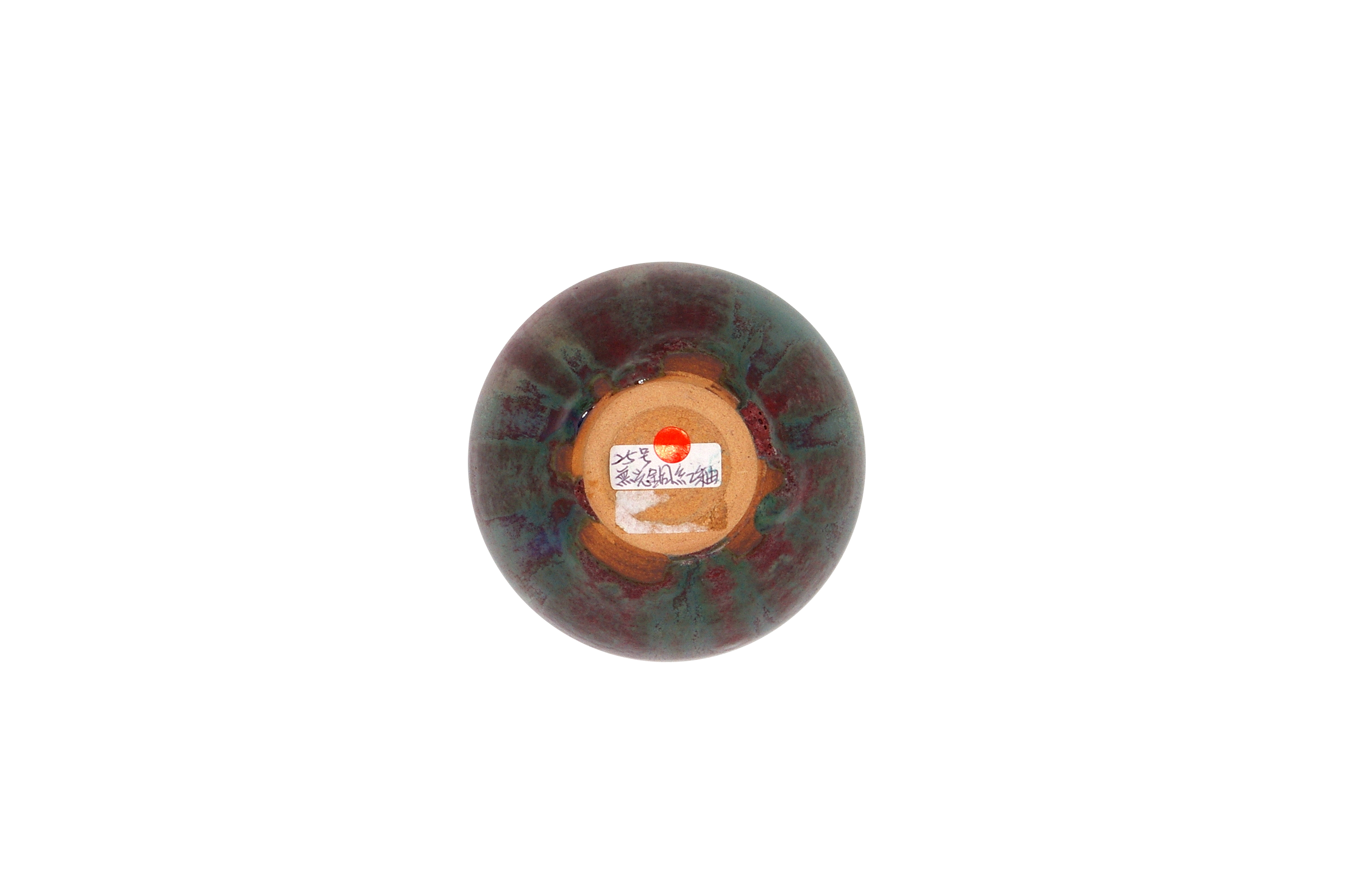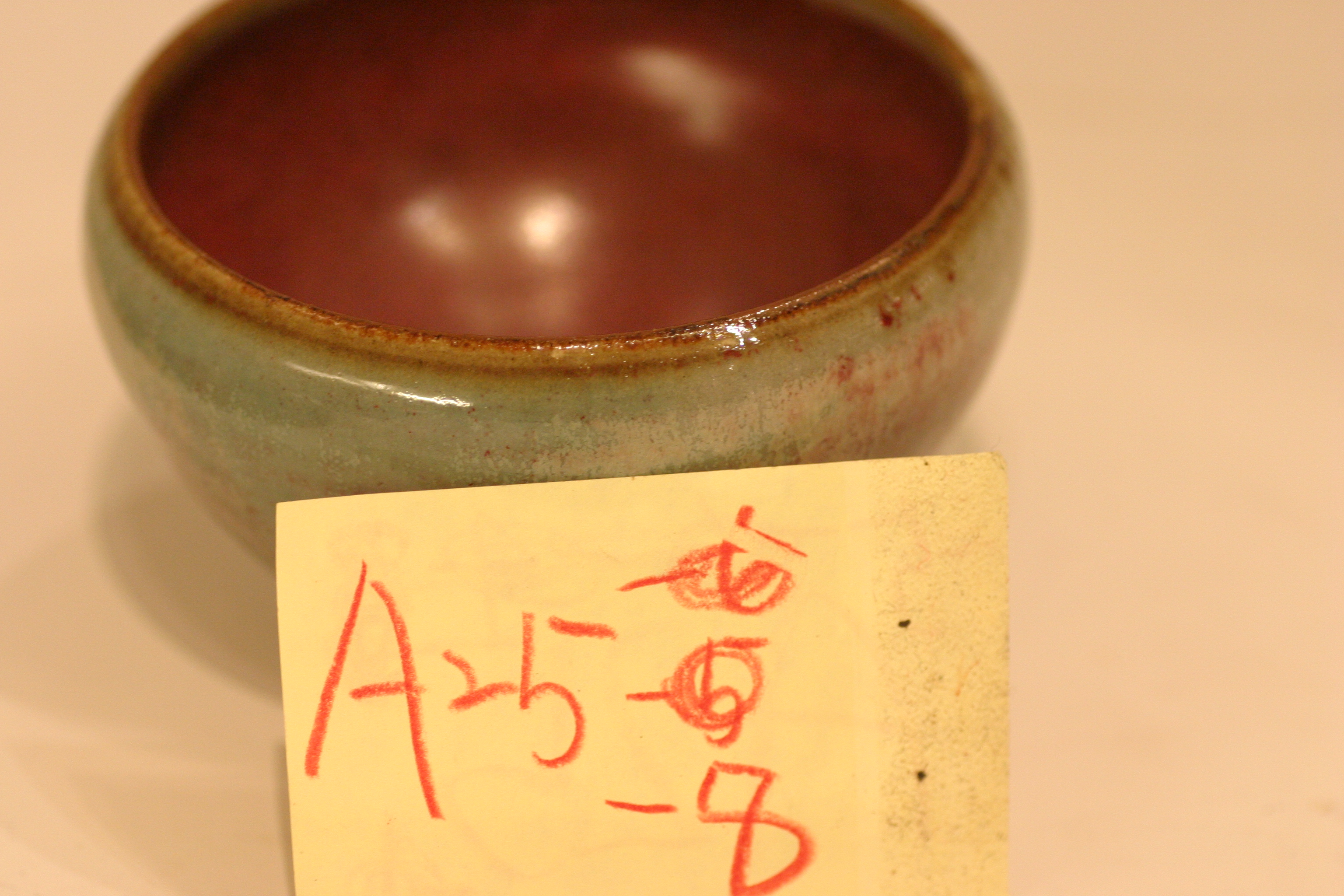 釉色:偎紅挹翠釉 ‧ 1.碗底留有刻字(被標籤掩蓋) 2.碗底留有一標籤(25號無光銅紅釉)及一紅點貼紙 3.碗底有標籤撕下的痕跡 (CY)