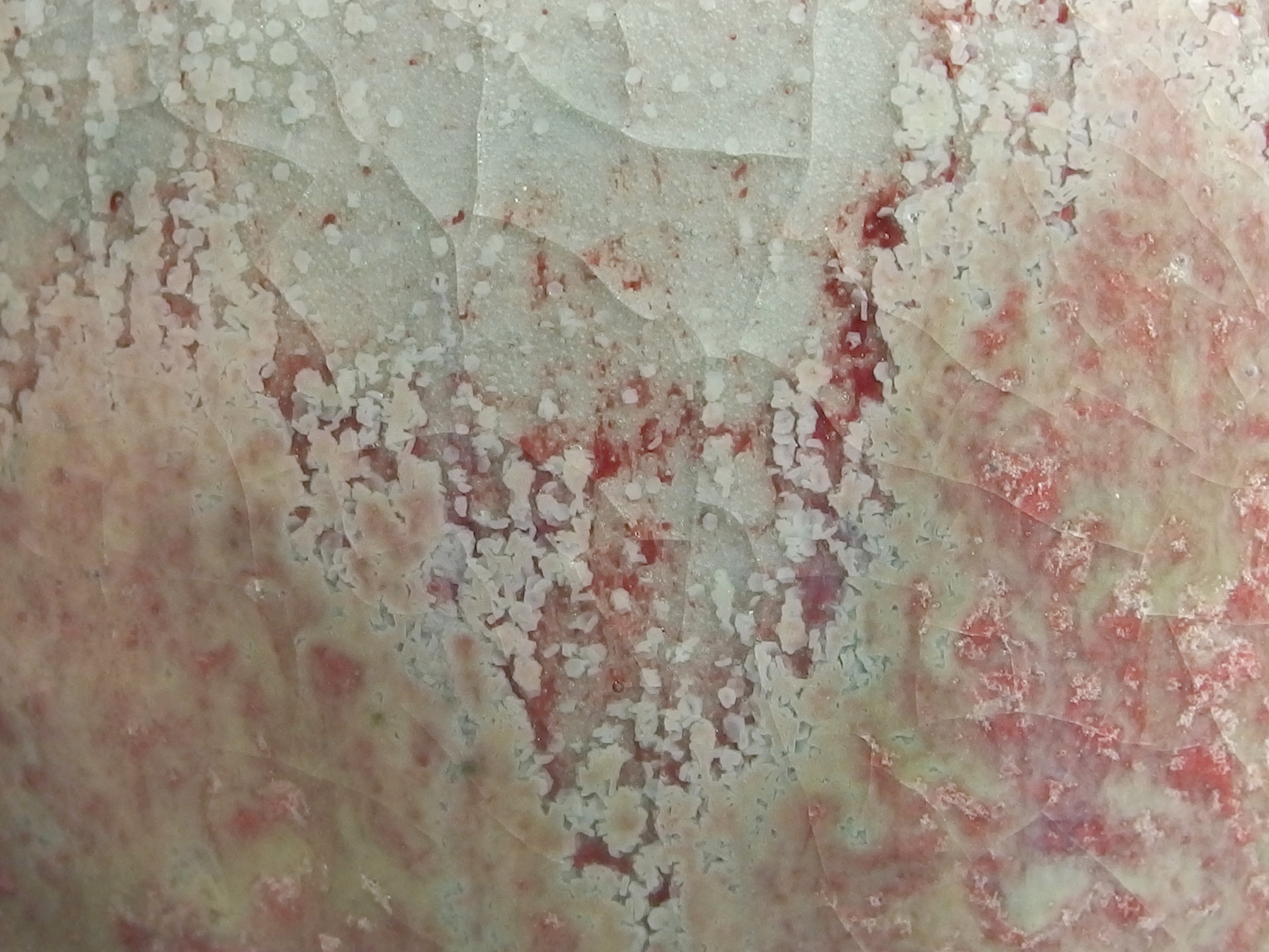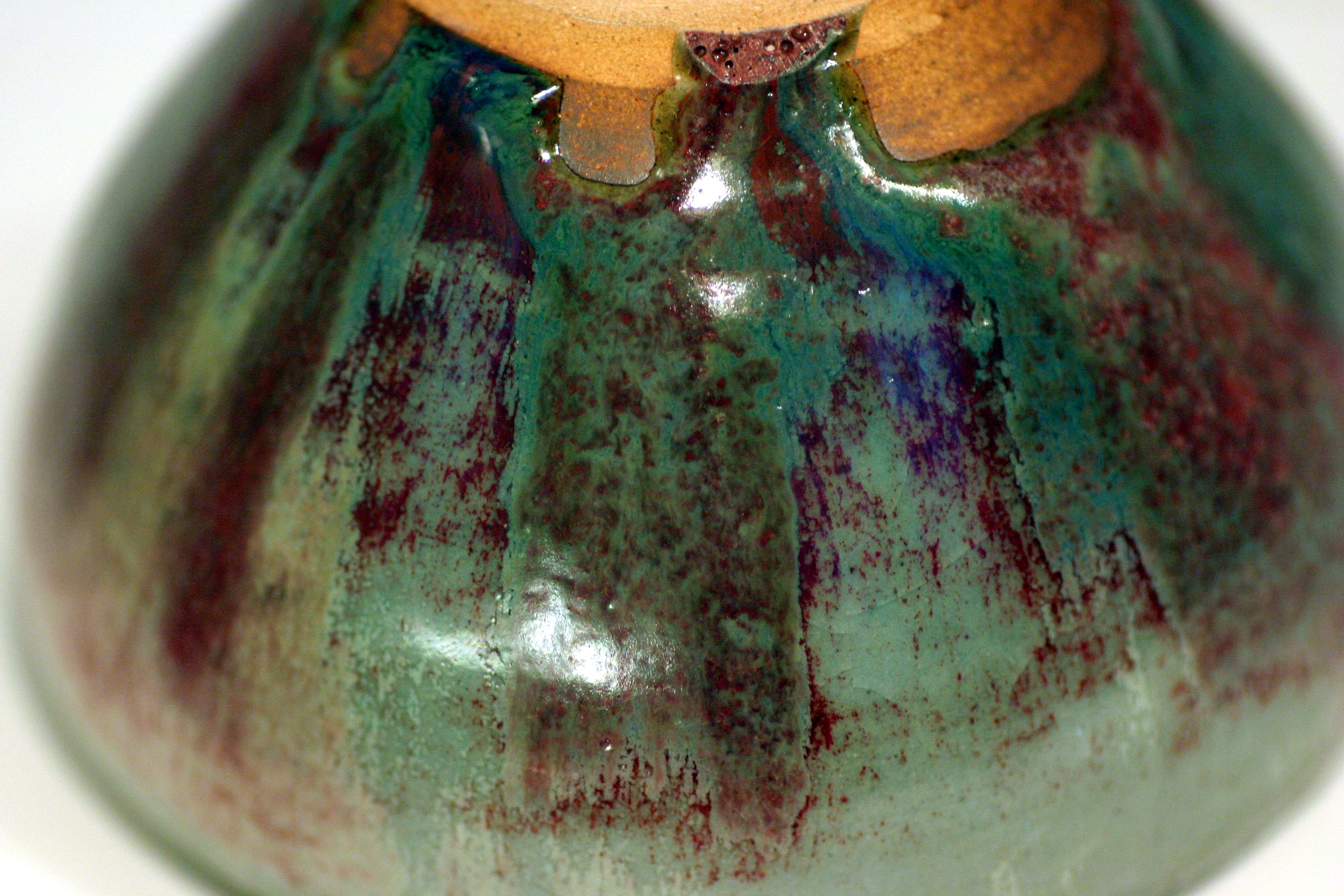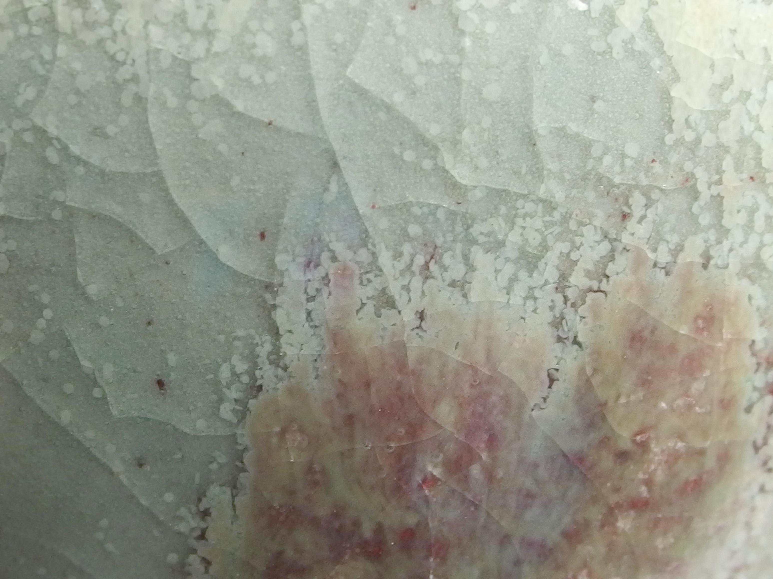 釉色:偎紅挹翠釉 ‧ 1.碗底留有刻字(被標籤掩蓋) 2.碗底留有一標籤(25號無光銅紅釉)及一紅點貼紙 3.碗底有標籤撕下的痕跡 (CY)